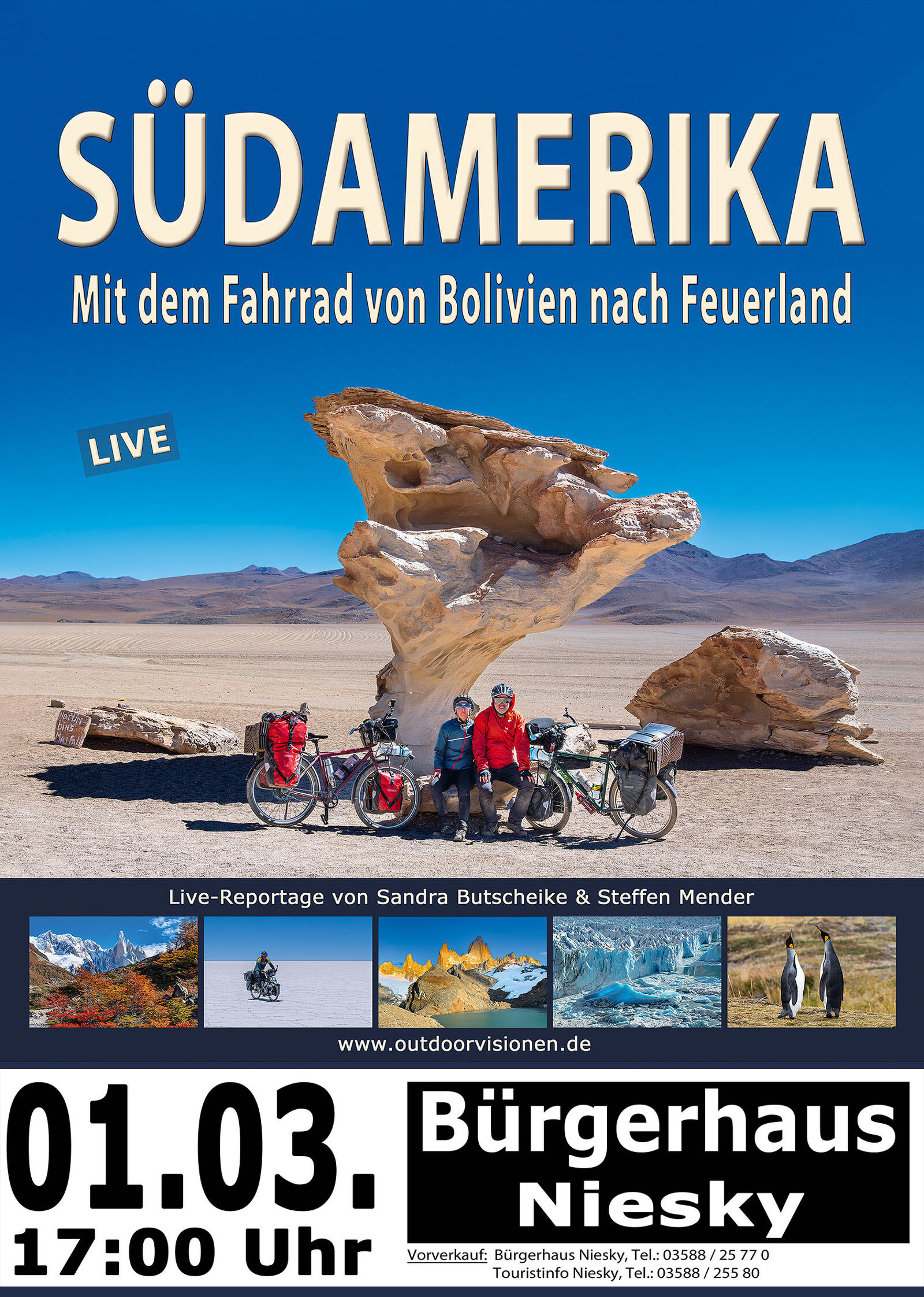 Über ein halbes Jahr radelten die Fotografen und Filmemacher von Bolivien bis ans schönste Ende der Welt, nach Feuerland.Salzwüsten, Sandwüsten, Vulkane, beeindruckende Wälder, majestätische Berge, Wasserfälle, rauschende Flüsse ...